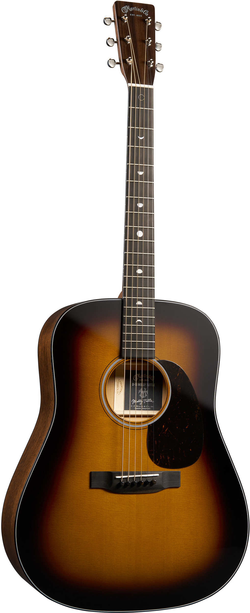 Martin D-18 Molly Tuttle został zaprojektowany, aby uhonorować zarówno tradycję, jak i przełomową artystkę. Inspirowany osobistym modelem D-18 z 1943 roku Molly, ten sygnowany instrument wyposażono w przesunięte do tyłu scallopowane ożebrowanie, wąską szerokość siodełka 1 11/16″, cenioną przez bluegrassowych flatpickerów, oraz autentyczny profil gryfu z lat 40. XX wieku. Unikalne detale obejmują niestandardowe inkrustacje faz księżyca na podstrunnicy, srebrne logo Martin na główce, owalne guziki kluczy stroikowych oraz płytę wierzchnią w wykończeniu Vintage Sunburst — całość uzupełnia formowany futerał hardshell w stylu vintage, nawiązujący do futerałów wydawanych w latach 70. Wykonana z litej płyty wierzchniej świerkowej, litego mahoniowego tyłu i boków oraz hebanowych elementów, gitara oferuje dynamikę, klarowność i równowagę, jakich muzycy oczekują od modelu D-18. To prawdziwy model artystyczny, odzwierciedlający styl, brzmienie i wizję Molly.